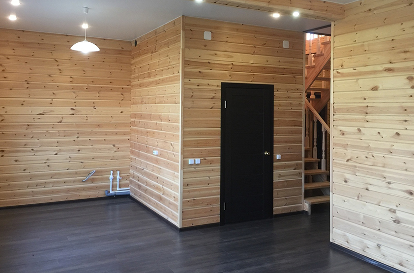 отделка стен: имитация бруса с окраской; потолки натяжные или гипсокартон