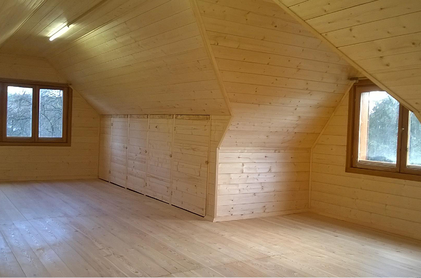 Внутренняя отделка под ключ, - стены обшиваются деревом, устанавливаются двери и межэтажная лестница. При установке каркаса сразу делается разводка электросети. Потолки: натяжные, гипсокартон под покраску или отделка под дерево.