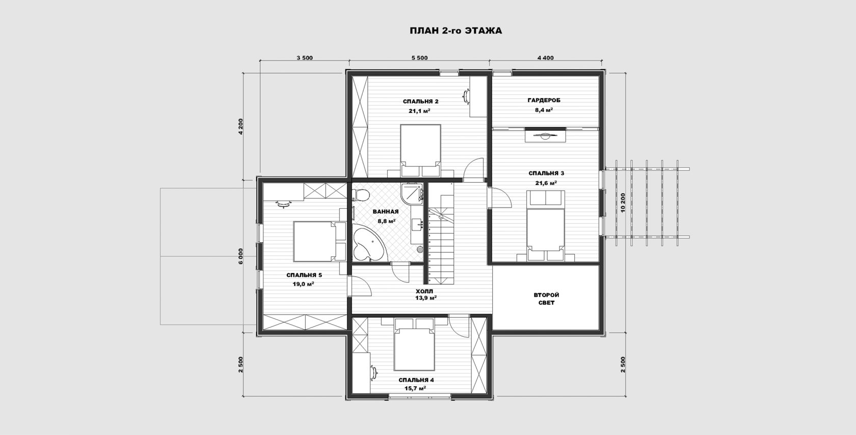 Планировка второго этажа включает 4 спальни, второй свет, гардероб и ванную.