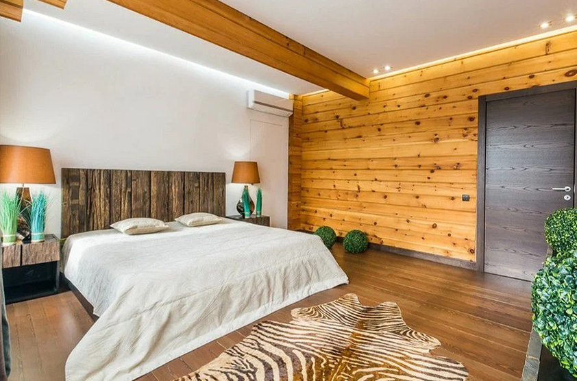 С эстетической точки зрения возможен вариант отделки, в котором присутствуют различные варианты отделки. Когда вместе комбинируются гипсокартон и вставки, имитирующие брус, возникает изысканный результат – на фоне крашенных или покрытых обоями стен выигрышно смотрятся акценты из натурального дерева.