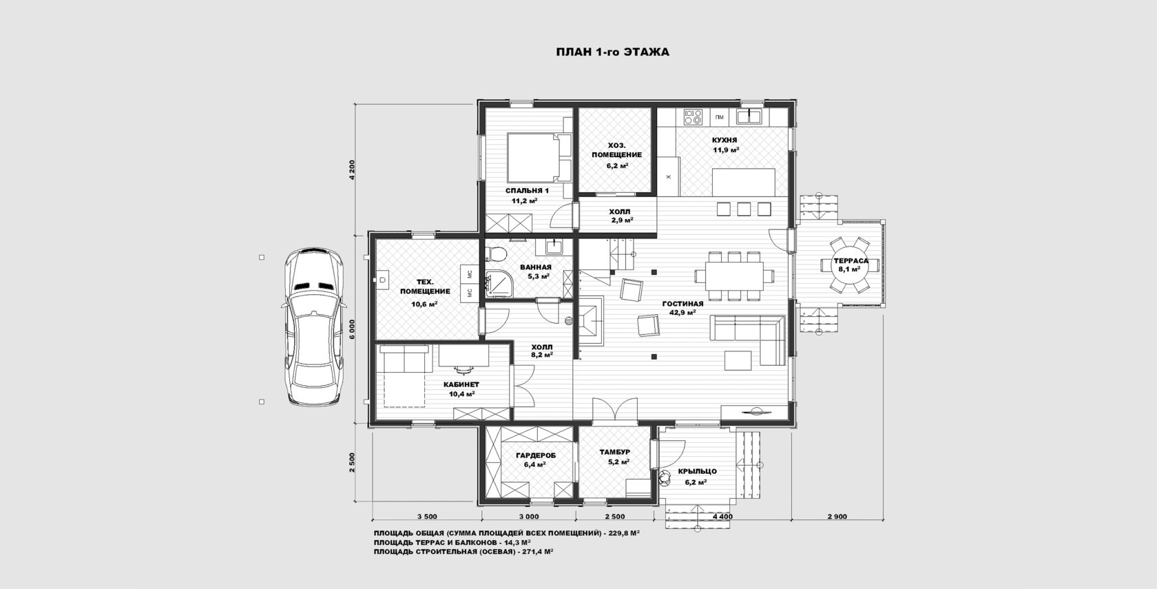 Планировка первого этажа включает гостиный зал с кухней, хоз. и тех. помещения, ванную, тамбур, гардероб, кабинет, спальню, навес для машины, крыльцо и террасу.